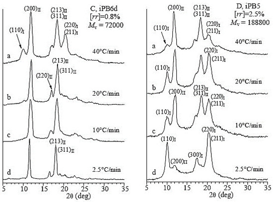 WAXD profiles of the iPBu melt-crystallized during cooling at different rates under varied conditions. Reproduced with permission from Ref. [91], copyright 2011 Elsevier Ltd.