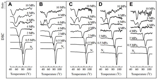 DSC diagrams recorded during non-isothermal melt-crystallization processes of iPBu under atmospheric N2 and CO2 at various pressures. The cooling rates are: (A) 5 °C/min; (B) 2.5 °C/min; (C) 1 °C/min; (D) 0.5 °C/min; and (E) 0.25 °C/min. Reproduced with permission from Ref. [91], copyright 2011 Elsevier Ltd.