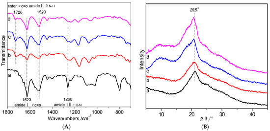 FTIR spectra (A) and XRD curves (B) of (a) the control silk fabric, (b) 15.62% of HC-silk-g-PHPMA, (c) 29.01% of HC-silk-g-PHPMA, and (d) 38.87% of HC-silk-g-PHPMA.
