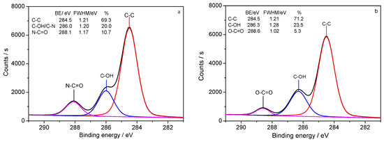 The curve fitting analysis of C1s spectra of (a) the control silk fabric and (b) 38.87% of HC-silk-g-PHPMA.