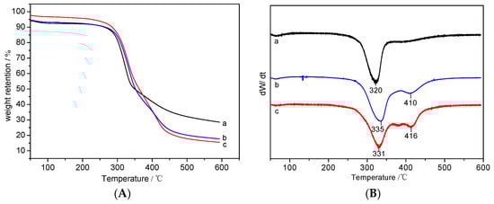TG curves (A) and DTG curves (B) of (a) the control silk fabric, (b) 29.01% of HC-silk-g-PHPMA, and (c) 38.87% of HC-silk-g-PHPMA.