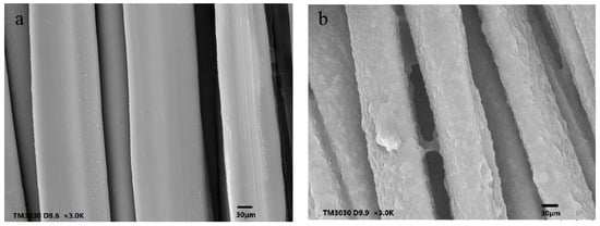 Morphology of the silk samples was observed at 3.00 k magnification by a Hitachi TM3030 Desktop SEM (Hitachi TM3030, Hitachi Ltd., Tokyo, Japan) at an acceleration voltage of 3 kV under vacuum condition. The samples were mounted on a conductive adhesive tape and coated with gold before testing.