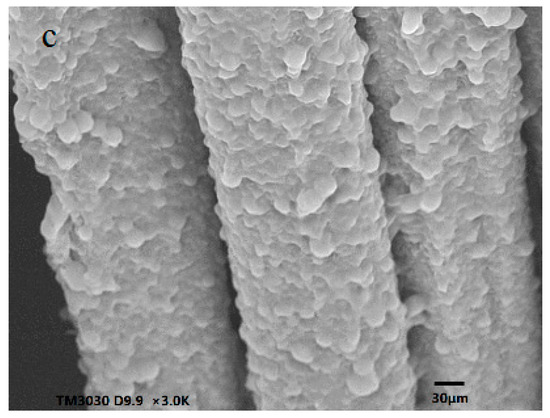 SEM images of (a) the control silk fabric, (b) 29.01% the HC-silk-g-PHPMA, and (c) 38.87% the HC-silk-g-PHPMA.