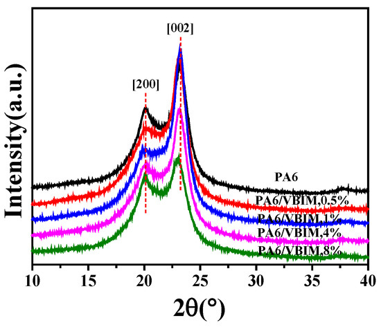 Many crystalline polymorphs can be identified in PA6, of which α and γ are two major crystal forms [33]. The chains in α crystals are the fully extended zigzag conformation, and the hydrogen bonds are among antiparallel chains; while in γ crystals, the hydrogen bonds are formed among parallel chains with twisted conformation, which lead to shorter chain-axis repeat and the formation of pleated sheets [4,34,35]. The crystalline forms of neat PA6 and the PA6/VBIM blends were characterized by XRD, as shown in Figure 2. Only one typical crystalline form can be distinctively identified from the pattern of PA6: two peaks at 2θ = 20.1°, 2θ = 23.2° are assigned to the [200] and [002] reflections of α form crystals, respectively [36]. The crystalline form does not change with the incorporation of VBIM, implying that, even though there are strong interactions between PA6 and VBIM because VBIM and PA6 are miscible, VBIM does not participate in, and has no effect on the crystallization process. Additionally, the diffraction peaks of the PA6/VBIM, 8 wt % blend shift to a lower position slightly. We consider that the insignificant shift of the peak is caused by the different flatness or thickness of the 8 wt % content blend. Thus, the strong interactions between VBIM and the PA6 matrix may obstruct the process of crystallization, but the VBIM is finally expelled from the crystalline region to the amorphous region so that the crystalline form and interplanar space remain unchanged.