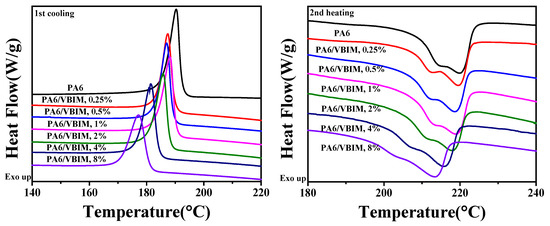DSC first cooling (after 5 min isothermal for erasing heat history) and second heating curves of PA6 and the PA6/VBIM blends with different VBIM loadings.