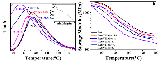 The loss tangent (a) and storage modulus (b) as functions of temperature for neat PA6 and the PA6/VBIM blends. The inserted sketch on the top right corner in Figure 4a shows how Tg varies according to VBIM contents in the blends.