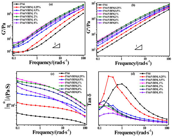 Figure 6d exhibits tan δ curves of PA6 and PA6/VBIM blends as a function of angular frequency. It is believed that tanδ against angular frequency curves are more sensitive to the irreversible structure change of polymers compared to plots of the modulus against angular frequency [41]. For neat PA6, the curve culminates in vicinity of 1 rad/s, which is the typical non-terminal behavior of solid-like polymers. The result is consistent with the conclusions mentioned above. As comparisons, the curves of PA6/VBIM blends culminate at relatively lower frequencies, indicating stronger intermolecular interactions and greater resistance of molecules movement due to the physical interactions between PA6 and VBIM. Furthermore, tan δ decreases remarkably with the addition of VBIM at higher frequencies, and the more the VBIM is incorporated, the lower the value that tan δ drops to, which means an increase of the elastic response of PA6/VBIM blends, as well as an increase in the terminal relaxation time.