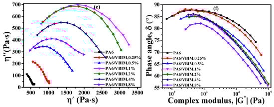 The van Gurp-Palmen (vGP) plot displays the relationship between the phase angle (δ) and logarithmic complex modulus (|G*|), which is chosen to verify the time temperature superposition principle, polydispersity of the linear polymer, long chain branched polymer, rheological percolation of polymer blends, and the miscibility of polymer blends [52,53,54,55,56]. The phase angle (δ) is a characteristic response to liquid-like or solid-like behavior and ranges from 90° for ideal Newtonian liquid to 0° for ideal Hookean solid [57]. The vGP plots of PA6 and PA6/VBIM blends are given in Figure 6f. For neat PA6, the δ is close to 90°, corresponding to complete viscosity in the terminal region. The combination of VBIM in the PA6 matrix does not alter the development of the vGP plot compared to that of PA6, which means there is no phase separation in PA6/VBIM blends. However, the vGP plots of PA6/VBIM blends do not merge into the common curve with PA6, and the δ decrease markedly at whole range of |G*|. We preferred to attribute the phenomenon to the increased elasticity of PA6 after introducing VBIM due to improved interactions between PA6 and VBIM.