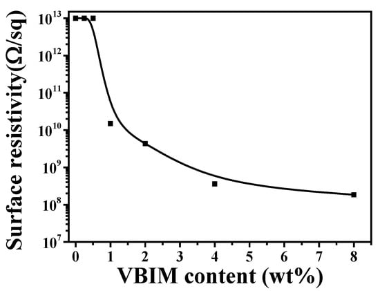 Surface resistivity of PA6 and the PA6/VBIM blends as a function of VBIM contents. This section may be divided by subheadings. It should provide a concise and precise description of the experimental results, their interpretation, as well as the experimental conclusions that can be drawn.
