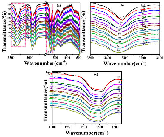 The temperature variable FTIR spectra from 210 to 250 °C of: (a) neat PA6 and the PA6/VBIM, 1 wt % blend; (b) zoomed area of the N–H stretching band; and (c) zoomed area of the amide I band.
