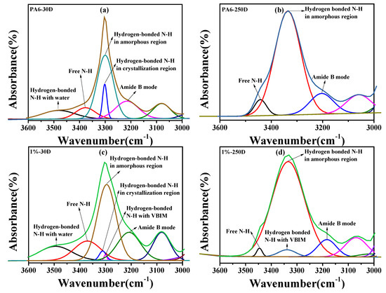 Curve-fitting of the N–H stretching band of (a) PA6 at room temperature; (b) PA6 at 250 °C; (c) PA6/VBIM, 1 wt % blend at room temperature; and (d) the PA6/VBIM, 1 wt % blend at 250 °C.