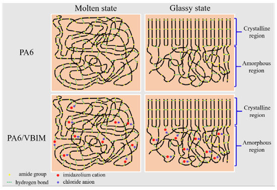 A schematic of the interactions between PA6 and VBIM under molten and glassy states.