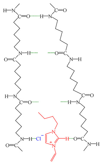 Taking the FTIR results above into consideration, the effects of VBIM on structure and properties of PA6 are well-understood. A schematic diagram is drawn to illustrate the effects of VBIM on PA6 matrix (Figure 11). Under the molten state, there are free amide groups generated because of the breakage of the original hydrogen bond in neat PA6, but most of the amide groups are still hydrogen bonded. The crystallization by cooling down from the melt leads to the formation of α crystal which is stable and confirmed by XRD patterns while, in the PA6/VBIM blend, the process will be discussed in two cases according to the content of VBIM. In the first case, the free amide groups in PA6 matrix are occupied by ions with 0.25–1 wt % VBIM at molten state. The more the VBIM is incorporated to PA6 matrix, the more free amide groups are consumed. Almost all free amide groups are taken up with 1 wt % VBIM. To be specific, the imidazolium cations coordinate with the C=O groups in one amide group while the chloride anions interact with N–H groups on another adjacent amide group. In addition to the interaction between ions and amide groups, there are also strong interactions between cations and anions. Consequently, the combination of 0.25–1 wt % VBIM enhanced the interchain interactions of PA6 matrix, leading to good miscibility of VBIM in the PA6 matrix and a prominent enhancement in |η*|, G′, G″, and so on. The value of |η*|, G′, and G″ culminate at 1 wt % VBIM content because almost all free amide groups are re-bonded at this circumstance with the strongest interchain interactions provided. The crystallization process from the melt will be retarded due to strong interactions between VBIM and PA6 molecular chains, resulting in decreased Tc. Based on the results of XRD, VBIM was expelled out from the crystalline to the amorphous region; thus, the concentration of VBIM in amorphous region below melting temperature is higher than that in totally amorphous region. Correspondingly, Tg increased with 0.25–0.5 wt % VBIM compared to that of PA6, and reached the maximum value at 0.25 wt % VBIM content according to DMA results, which is much less than 1 wt %. In the second case, only a portion of 2–8 wt % VBIM will form hydrogen bond with free amide groups, at the same time, ions of redundant VBIM will interrupt the original hydrogen bond and form a new one with the “freed” amide groups. The destruction of original hydrogen bond and re-building of the hydrogen bond with ions in VBIM are sketched in Figure 12. Hence, the structure and properties of PA6 matrix are determined jointly by both the destruction of original hydrogen bond and the formation of new ones. However, the formation of one new hydrogen bond would sacrifice several original ones. Thus, even though there are stronger interactions between VBIM and PA6, |η*|, G′, and G″ declined slightly with 2–8 wt % VBIM incorporated compared to the PA6/VBIM, 1 wt % blend. Additionally, the crystallization process from the melt will be retarded further, resulting in decreased Tc and χc. The same trend is also observed for Tg.