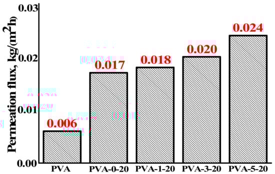 The data presented in Table 5 demonstrate that the permeation flux of supported membranes is ca. 10 times larger than for the dense membranes (Section 3.1.2, Figure 2). The fullerenol-containing membrane PVA-5-20 has higher permeation flux and water content in the permeate if compared to PVA-0-20 membrane. The improvement in the permeability can occur due to an increase of the number of hydroxyl groups on the surface of the membrane, modified by fullerenol and, consequently, an increase in the number of transport channels for water transfer during the dehydration of isopropanol. The result is in agreement with the data of SEM and the contact angles (Figure 5, Table 3). The improvement of the water content in the permeate of PVA-5-20 membrane is due to a deeper cross-linking of the polymer chains, which is in agreement with the swelling data (Section 3.2.5, Table 4).