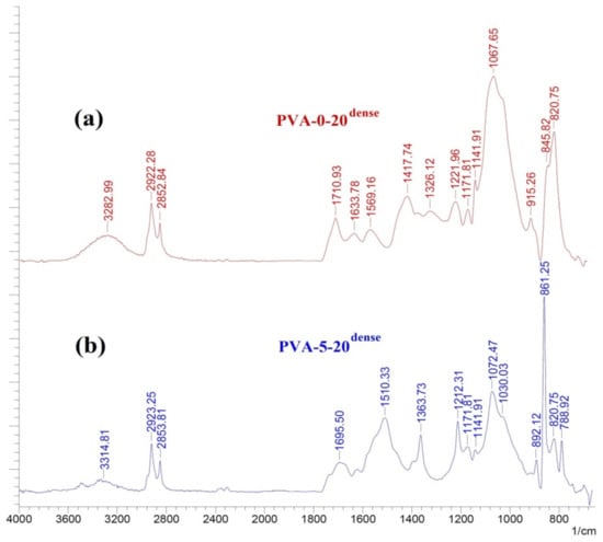 IR spectra of (a) PVA-0-20dense; (b) PVA-5-20dense samples.