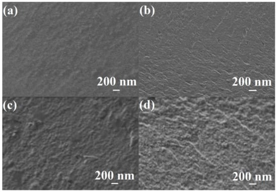 Cross-sectional SEM micrographs of (a) PVA-0-20dense; (b) PVA-1-20dense; (c) PVA-3-20dense; and (d) PVA-5-20dense membranes (200 nm).