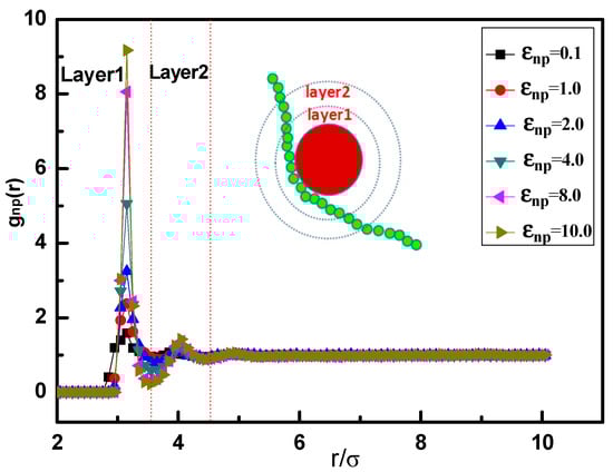 Before the discussion, we first examine the local structure of polymer close to the surface of NP in nanocomposites and define the polymer-NP interfacial region. Take pure linear chain for example, as shown in Figure 1, the polymer-NP pair distribution function for various attraction exhibits an evident layering behavior. The obviously high monomer density in “Layer1” (shown in Figure 1) establishes a well defined interface between the polymer and NP, therefore we take the “Layer1” as the polymer-NP interfacial region in the following study. Meanwhile, we present the whole chain in the snapshots of nanocomposites by only one or more monomers per chain located within Layer1. Figure 1 also shows that the polymer density around NP increases with increasing from weak to strong attraction, which is consistent with the studies by Gao et al. [] and Karatrantos et al. [].