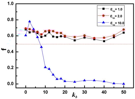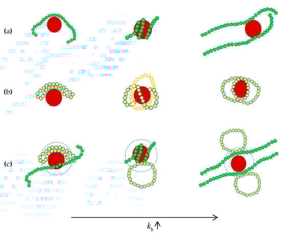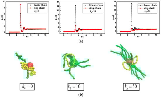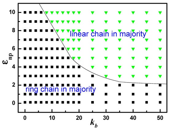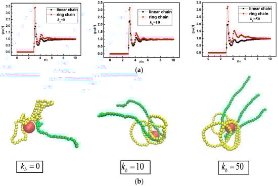 For the strong polymer-NP interactions , our previous study also has given the results that the inner monomers of chains prefer to wrap tightly the surface of NP, which performs a “middle” adsorption behavior [,]. Figure 5 shows a ring-to-linear selective adsorption transition with increasing chain stiffness. As = 0, i.e., flexible chain, this “middle” adsorption mechanism that the middle monomers of polymer chain tend to cover the surface of NP, drives the ring chains still in majority in comparison with linear chain, due to its closed topology structure. As = 10, i.e., semiflexible chain, the middle image in Figure 5b shows that the linear chains favorably wrap around NPs and predominantly crowd the ring chains out of the interfacial region. On the one hand, this phenomenon can be attributed to the fact that the linear semiflexible chains with a proper stiffness are inclined to form a chiral helical structure [], which is commonly observed in biological environments. For instance, the negatively charged stiff polymer (DNA) wraps around a cationic core particle (protein), in which the packing manner is referred to as a nucleosome-like structure [,,].