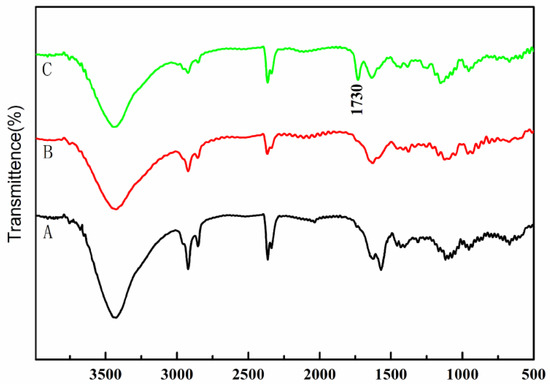 FTIR spectra of (A) untreated CF, (B) nitric acid and sulfuric acid-treated CF, and (C) MMA-treated CF.