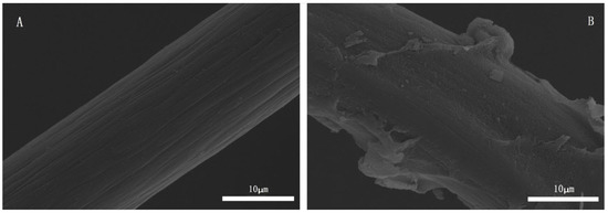 The SEM images of untreated CF and PMMA-g-CF are shown in Figure 2. As shown in Figure 2A, it can be observed that the untreated CF with a few narrow grooves is relatively neat and smooth. In contrast, the surface of the PMMA-g-CF in Figure 2B becomes rough and is wrapped by a thick layer of polymer. This indicates that PMMA is chemically grafted on the carbon fiber, generating a layer of PMMA particles on the carbon fiber’s surface. The rougher surface on the grafted carbon fiber is expected to be of benefit to improve the adhesion of grafted CF and the matrix, which then improves the mechanical properties of the composites.