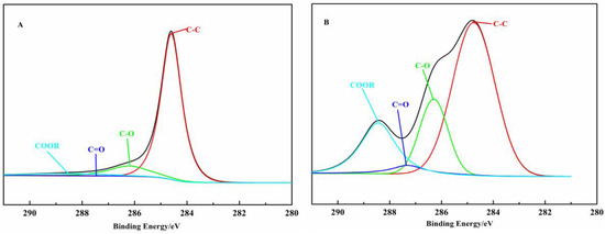 The chemical composition and functional groups of CF and chemical modification of CF were characterized by X-ray photoelectron spectroscopy (XPS) (ESCALAB250, Thermo Scientific, Beverly, MA, USA) using 300 W Al Kα radiation. The base pressure was about 3 × 10−9 mbar. The binding energy peaks were calibrated with C1s at 284.6 eV as a reference.