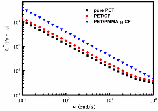 Complex viscosity (η*) vs. angular frequency (ω) for pure PET, PET/CF, and PET/PMMA-g-CF composites.