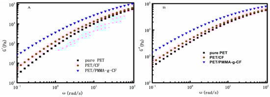 (A) Storage modulus (G′), and (B) loss modulus (G″) as a function of the frequency of pure PET, PET/CF, and PET/PMMA-g-CF composites.