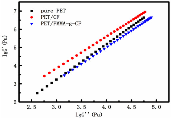 It is generally believed that the homogeneity of polymer melts or solutions can be characterized by the plot of G′ versus G″, which is named the modified Cole-Cole plot by Harrell and Nakajima [23], and the slope value of 2 obtained from the G′ versus G″ plot indicates a homogeneous and isotropic polymer solution or melt [24,25,26]. The plots of G′ versus G″ for pure PET, PET/CF, and PET/PMMA-g-CF composites are shown in Figure 7. One can see that the PET/CF and PET/PMMA-g-CF composites exhibit a deviated curve. The introduction of CF decreases the slope producing the deviation from the master curve corresponding to the PET matrix, indicative of the increased heterogeneity in the system. However, the deviated extent of the PET/PMMA-g-CF composite decreases. This phenomenon suggests that surface modification of CF improves the compatibility between the CF and PET, and then decreases the heterogeneity of the polymeric systems.