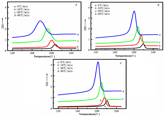 Non-isothermal melt-crystallization exothermal of (A) pure PET, (B) PET/CF, and (C) PET/PMMA-g-CF composites at different cooling rates.