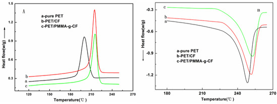DSC (A) cooling and (B) the second heating thermograms of PET, PET/CF, and PET/PMMA-g-CF composites.