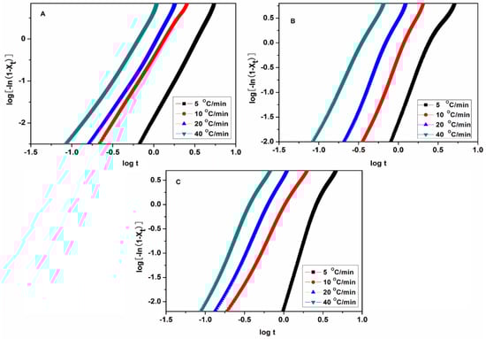 Plots of log[−ln(1 − Xt)] vs. logt for non-isothermal crystallization of (A) pure PET, (B) PET/CF, and (C) PET/PMMA-g-CF composites at different cooling rates.
