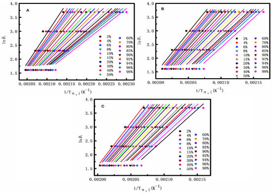 Figure 11 shows the analyses of PET, PET/CF, and PET/PMMA-g-CF composites by the Flynn-Wall-Ozawa method. By plotting of lnβi against 1/Ta,i, where i = 2%, 4%, 6%, 8%, 10%, 15%, …, 90%, 92%, 94%, 96%, 98%, and the Ea values can be calculated from the slope of the straight lines in Figure 11.