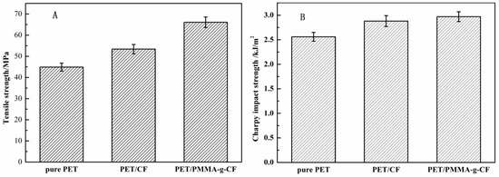 (A) Tensile strength and (B) Charpy impact strength of pure PET, PET/CF, and PET/PMMA-g-CF composites.