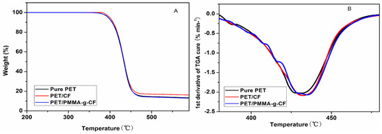 TG (A) and DTG (B) curves of thermal decomposition of pure PET, PET/CF, and PET/PMMA-g-CF composites.