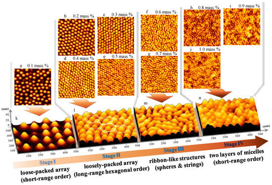 1 μm × 1 μm atomic-force microscope (AFM) topographies for micelles on SiOx/Si spun from toluene solutions containing polystyrene-b-poly(2-vinylpyridine), P(S-b-2VP), micelles at weight fractions: (a) 0.1; (b) 0.2; (c) 0.3; (d) 0.4; (e) 0.5; (f) 0.6; (g) 0.7; (h) 0.8; (i) 0.9 and (j) 1.0 wt %. Images (k–n), respectively, represents the three-dimensional (3D) topographies of two-dimensional (2D) images (a,d,g,j).