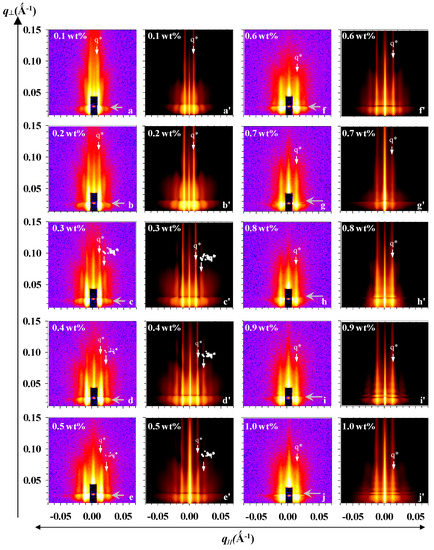 Grazing-incidence small-angle X-ray scattering (GISAXS) patterns (a–j) and IsGISAXS simulations (a′–j′) of micellar film on SiOx/Si spun from toluene solutions containing P(S-b-2VP) diblock copolymer at weight fractions: (a,a′) 0.1; (b,b′) 0.2; (c,c′) 0.3; (d,d′) 0.4; (e,e′) 0.5; (f,f′) 0.6; (g,g′) 0.7; (h,h′) 0.8; (i,i′) 0.9 and (j,j′) 1.0 wt %. All of the experimental images show a rod-shaped shadow resulted from the attenuation of a direct beam of X-rays by a copper beam stop. The intensity scale is logarithmic. Bright color (e.g., white & yellow) indicates high intensity of X-ray scattering. Vertical arrows label the positions of the diffraction Bragg’s rods, whereas parallel arrows label the intensity undulation due to the presence of the wetting layer and/or multiple layers.