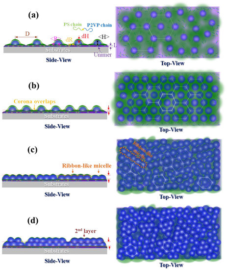 - Chang, C.-Y.; Wu, P.-J.; Sun, Y.-S. Kinetically controlled self-assembly of monolayered micelle films of P(S-b-4VP) on bare and PS-grafted substrates. Soft Matter 2011, 7, 9140–9147. [Google Scholar] [CrossRef]