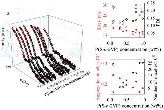 (a) Experimental small-angle X-ray scattering (SAXS) data (symbols) and fitted curves (lines) for P(S-b-2VP) core-shell micelles at varied mass fractions in toluene; (b) Mean radius of P2VP cores (rs, red filled circles), thickness of PS shells (ts, red open circles) and polydispersity of the P2VP cores (PDI, black open diamonds); and (c) aggregation number (red filled diamonds) and number of micelles (black filled triangles) as deduced from the fits are plotted as a function of P(S-b-2VP) concentration.