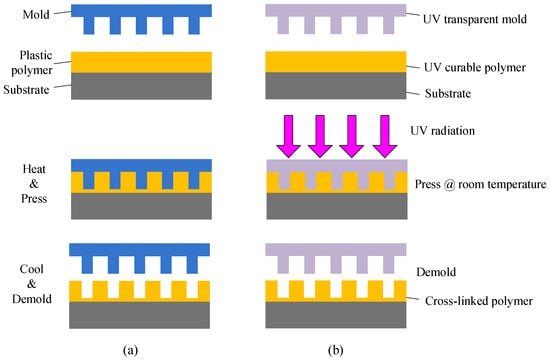 Schematic of fabrication process: (a) thermal imprinting and (b) UV imprinting.