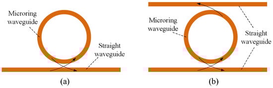 The basic microring resonator usually consists of a microring waveguide coupled with a single straight waveguide or double straight waveguides, as shown in Figure 2a,b. They can be utilized as the key structures of filters, modulators, switches, and sensors in the photonic integrated circuit [].