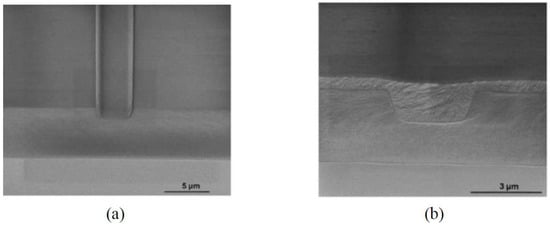 For the UV imprinting technique, the mold should be transparent for UV irradiation. There are two kinds of UV transparent molds. One is the hard mold made of the dielectrics, such as silicon oxide and silicon nitride [], and the other is the soft mold made of polymer materials, such as polydimethylsiloxane (PDMS) [,,], perfluoropolyether (PFPE) [,], and UV-curable resins []. The soft mold is relatively cheap due to the simple fabrication process. In addition, it is flexible in terms of the geometry and curvature of the surface, which provides better contact with the substrate. Furthermore, the demolding is usually easy using the soft mold, especially for large-area imprinting [,]. Therefore, the UV imprinting technique with soft mold, named the UV soft imprinting technique, is being widely investigated and applied to fabricate photonic integrated devices.