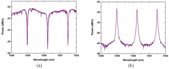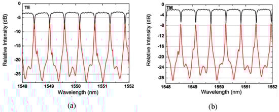 Measured transmission spectra of the inverted ridge waveguide microring resonator operating at (a) TE polarization and (b) TM polarization [].