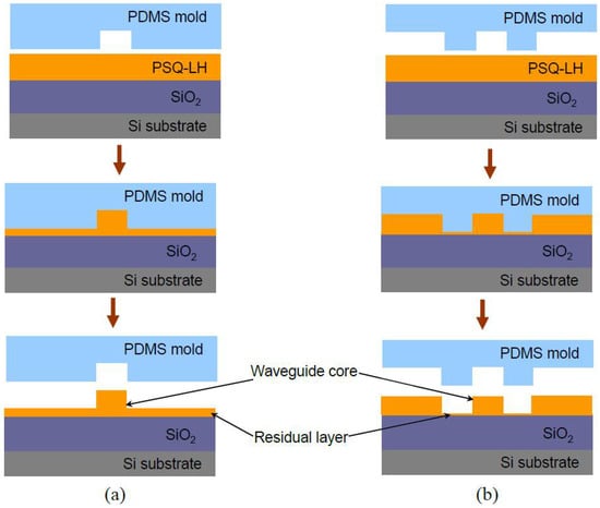 In [], the microring resonator with inverted ridge waveguide using the UV soft imprinting technique is presented. The polymer polysiloxane-liquid (PSQ-L) with two forms of a high index polymer PSQ-LH and a low index polymer PSQ-LL are utilized as the core and cladding materials for the inverted ridge waveguide. PSQ-L is a kind of silicate-based inorganic–organic hybrid polymer with properties of purely liquid (solvent free) and UV curable, which is compatible with soft-lithography []. Figure 3 shows the fabrication process of the inverted ridge waveguides. The cladding layer rather than the core layer is imprinted to form the groove, and then the core waveguide is defined using spin-coating step to fill the groove. This process smartly avoids the difficulty of controlling the thickness of residual layer in the conventional imprinting process with ridge structure. The thickness of the slab layer can be made thin enough by increasing the spin-coating speed or using diluted core polymer material. In addition, the structure imprinted in the cladding layer is helpful for forming the core waveguide using other techniques, such as ink-jet imprinting [].