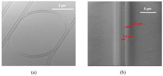 The SEM pictures of the racetrack microring resonator fabricated by the selective imprinting technique. (a) Image of the entire structure; (b) detail of the coupling region [].