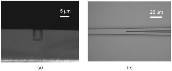 Y-branch-based optical waveguide splitter with preliminary demonstration of 1 × 4 structure is fabricated using the UV soft imprinting technique []. Polymer materials used in the experiment are fluorinated acrylate resin, LFR (ChemOptics, Daejeon, Korea), with the refractive indices ranging from 1.375 to 1.395 at 1550 nm wavelength. PDMS mold is replicated from a silicon mold through a casting molding method and properly cured after baking at 60 °C for 4 h. LFR with the lower refractive index is spin-coated on the silicon substrate as the under cladding layer. The grooves on the cladding layer fabricated from PDMS mold imprinting are filled with the LFR with higher refractive index as the core layer. The upper cladding layer is then spun on top using the same procedure. This inverted waveguide helps to reduce the thickness of the residual layer, which can be controlled by the spinning speed during the core layer preparation. Figure 10a shows the cross-section of the waveguide after being filled with higher refractive index LFR. It can be seen that the core shape is perfectly rectangular, and no layer is residual on the waveguide top. The optical image of Y-junction area is given in Figure 10b, which shows that the waveguide is split into two paths with a good form.