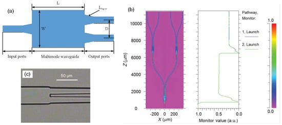 (a) Schematic of the MMI-based waveguide splitter; (b) the simulated beam propagation in 1 × 4 waveguide splitter; and (c) the microscopic image of the connection section between the multimode waveguide and the two single mode waveguides [].