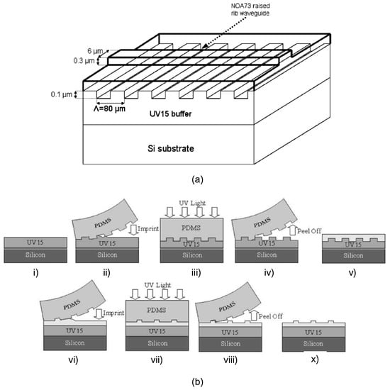 (a) Schematic structure of the LPWG; (b) two processes for imprinting the grating waveguides (i)–(v) and for rib waveguide (vi)–(x) []. Copyright 2005 IEEE.