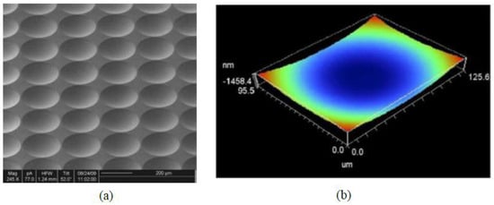 Microlenses and microlens arrays (MLAs) have shown promising ability for light collection and collimation, with a large range of applications including imaging sensors, interconnects, and photodetectors. Various fabrication methods for MLAs have been investigated. However, the fabrication cost is still too high for large-scale production due to the complex steps involved []. In [], the polymer 40 × 40 microlens array with a pitch of 250 μm, a diameter of 240 μm, and a sag height of 24.5 μm have been prepared. Microlenses are replicated into the UV curing polymer material PAK-01 by step and stamp UV imprinting technique on silicon substrates with a diameter of 150 mm. The resulting substrates are used as masters to cast PDMS templates. With the optimized dispense strategy, including the adjustment of the dispense height, pressure, and amplitude, air bubbles can be avoided in the dispensed resist layer. Figure 14a shows the SEM image of the replicated microlenses into the resist PAK-01. The surface of imprinted microlens profile measured by a white light profilometer is shown in Figure 14b.