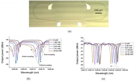 The MZI-based polymer microring resonator is fabricated using the UV soft imprinting technique, and then the micro-heaters are patterned using the lift-off process []. The optical microscopic image of the tunable microring resonator device is shown in Figure 16a. The tunable properties of the fabricated polymer microring resonator are characterized. Different coupling states [], including “over-coupling”, “critical coupling”, and “under-coupling”, are realized by applying the power only to the micro-heater on the MZI arm, as shown in Figure 16b. The controllable equivalent coupling coefficient is very useful for the application of microring resonator-based tunable time delay lines []. It is noted that such equivalent coupling coefficient tuning during this process generates an additional phase shift to the microring resonator, which results in a small resonant wavelength shift. It can be compensated for by tuning the phase shift on the microring waveguide. The resonant wavelength of the fabricated polymer microring resonator can also be tuned. This is realized by applying the power to the micro-heater on the microring waveguide, as the measured results show in Figure 16c. It can be seen that the resonant wavelength may be tuned freely within the FSR around 0.13 nm.