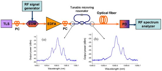 Experiment setup for RF signal transmission over fiber by using the tunable microring resonator as a notch filter, in which the insets (a) and (b) show the measured optical spectra of RF modulated lightwave before and after the microring resonator [].